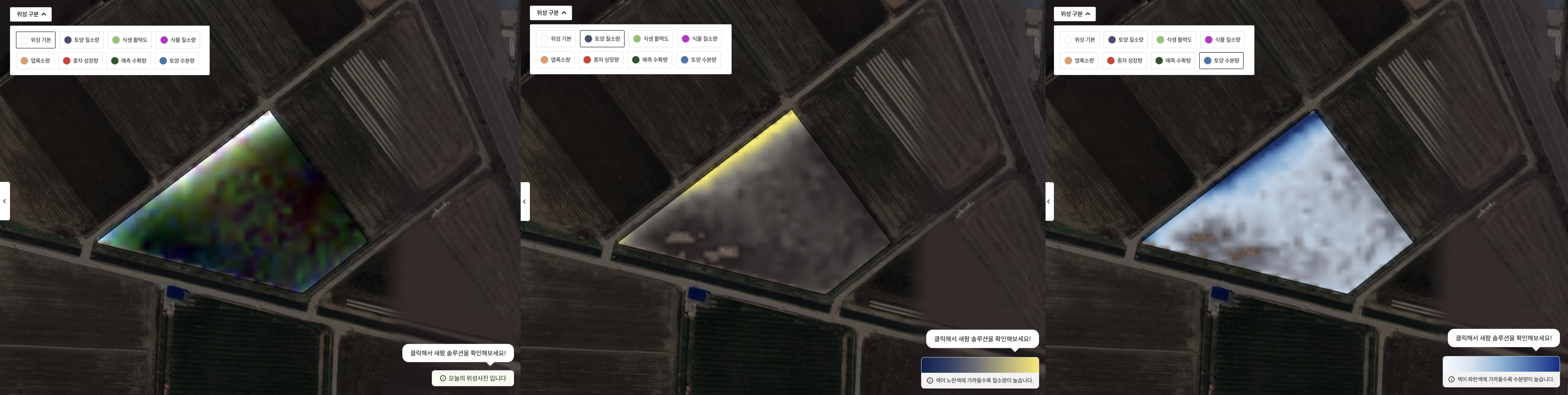 위성영상 분석위성영상을 통해 매일 토양 질소량, 토양 수분량, 엽록소량 등을 파악합니다.